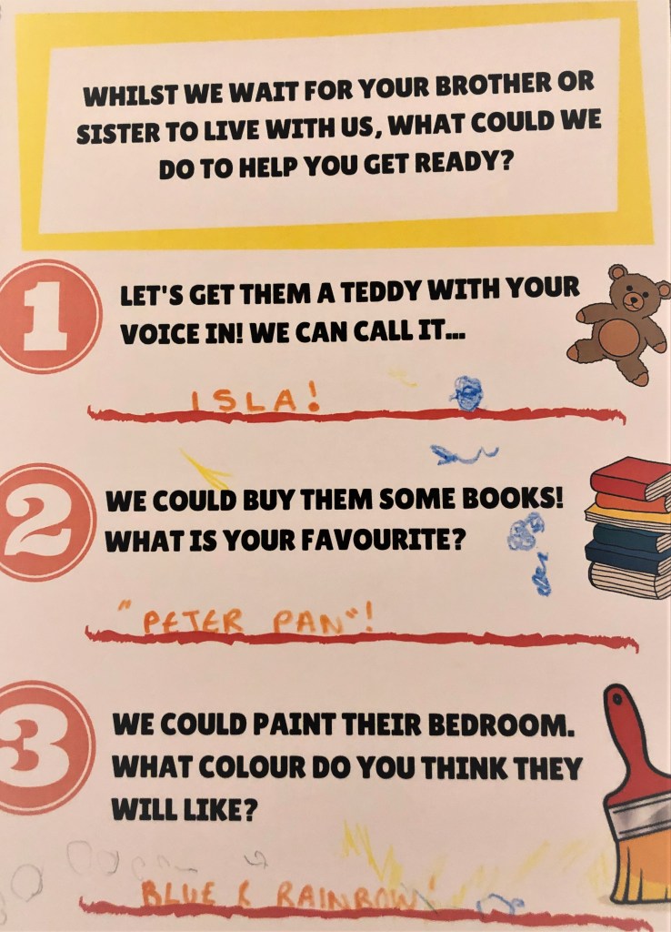 One of the biggest questions we had for our agency was how they were going to involve our birth daughter in the adoption process. How they would support her to be aware of what was happening. How they could help with the transition to the idea of an adoptive sibling. Our agency did not let us down and our social worker has been incredible. They’ve involved her throughout the process using creative play sessions and preparing a large part of our PAR (prospective adopter’s report) around how to support and raise her alongside an adoptive child.